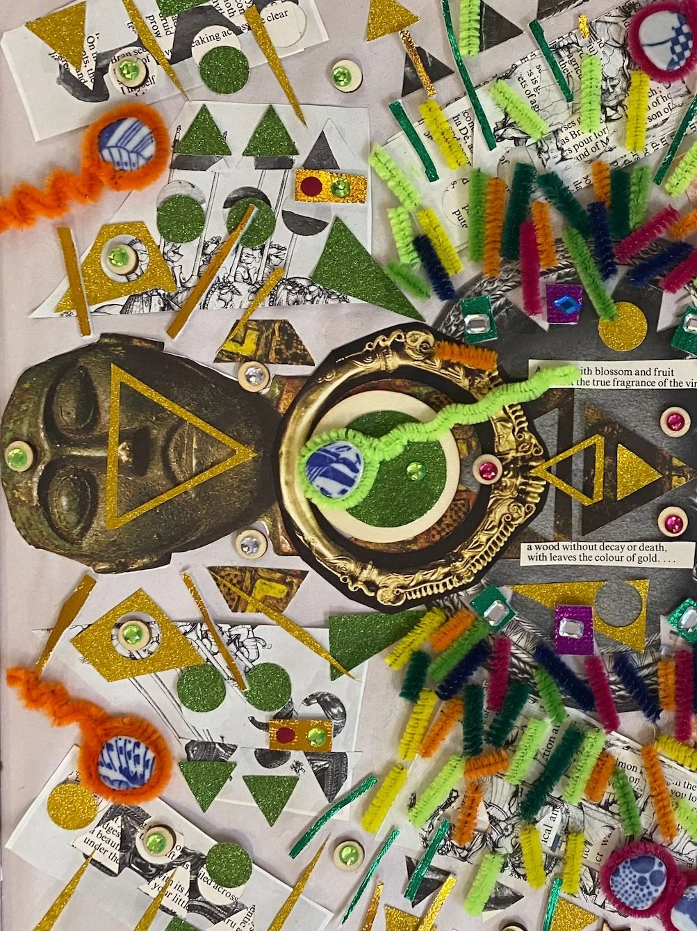 Michelle’s poetry, collage, and assemblage works explore the complexities of femininity within this hegemonic context, balancing wholeness and fragmentation, challenging hierarchies between art and craft. Using paper, ready-mades, and craft materials and techniques like washi tape and paper punches, traditional notions of beauty and value are disrupted, creating pieces that are visually striking and intellectually provocative. Hyper-feminine elements, often dismissed as decorative or frivolous, mask deeper critiques of cultural coding, where fragmented female bodies evoke the fractured self and invite a restructuring of identity. Ultimately, Michelle’s work seeks to reclaim femininity, with glittering excess as a form of resistance, encouraging viewers to reflect on their own deeper layers of identity.